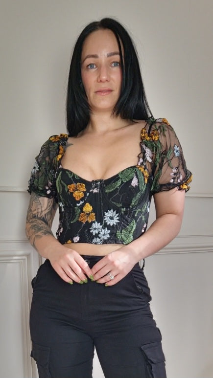 TIA - Embroided Floral Corset Top With Puff Sleeves
