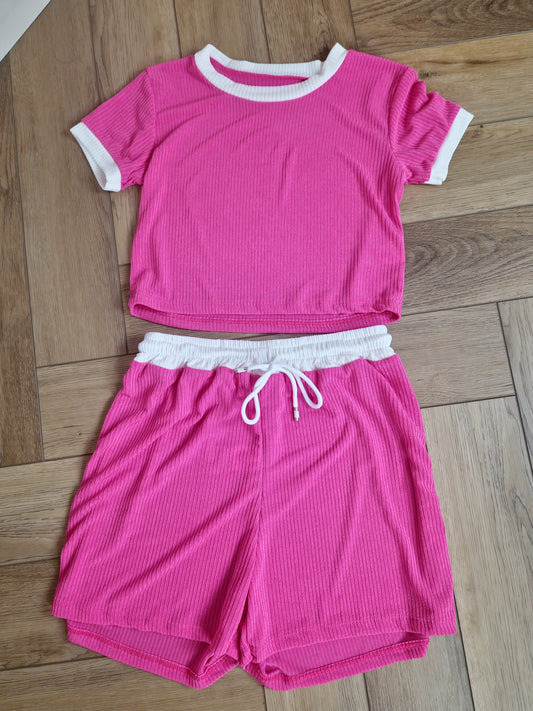 CODY - Contrast Ribbed Top & Short Set Hot Pink