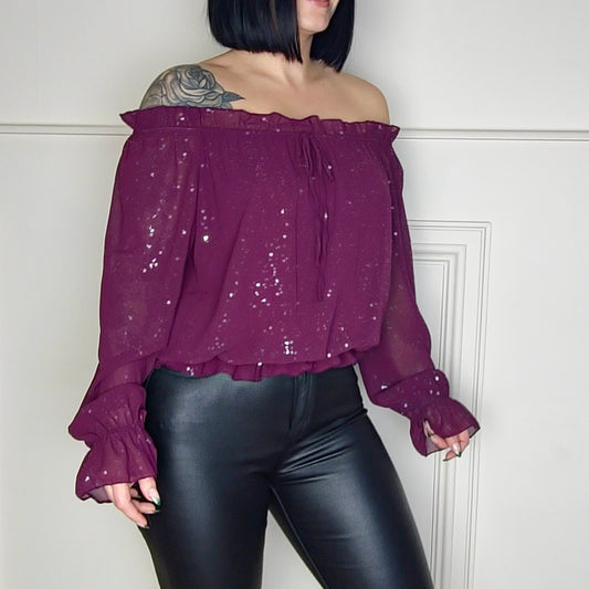 TOVA - Shimmer Off Shoulder Chiffon Blouse Plum